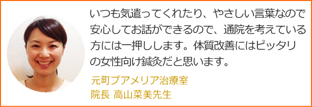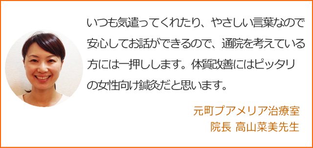 すごい生理痛が和らいだ感覚があって、6回~7回やっていただいたら、もう本当に薬は一切飲まなくてよくなったぐらいすごく楽になりました。今は、薬がなくても過ごせています。
