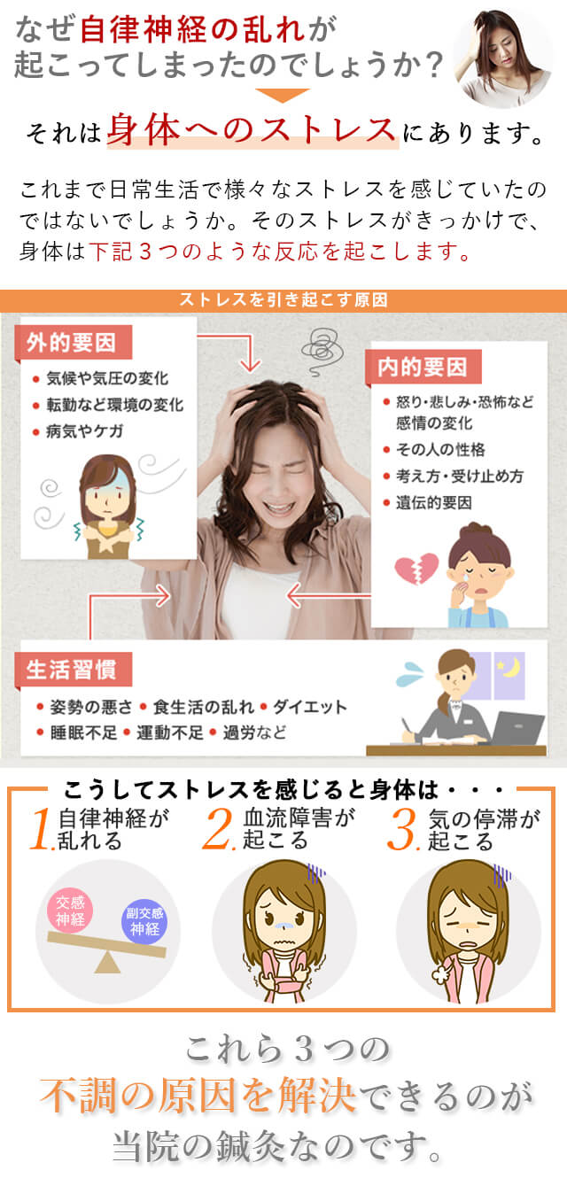 体全体の冷えや内臓機能の低下、疲労・ストレスなど、様々な要因も密接に関係しています。