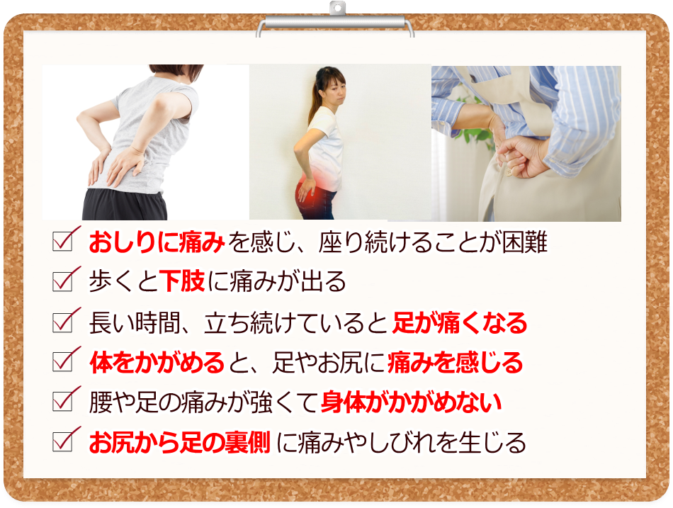 筋肉が固くなるなどの原因で坐骨神経が圧迫されると、坐骨神経痛のような辛い症状を生じるようになります。