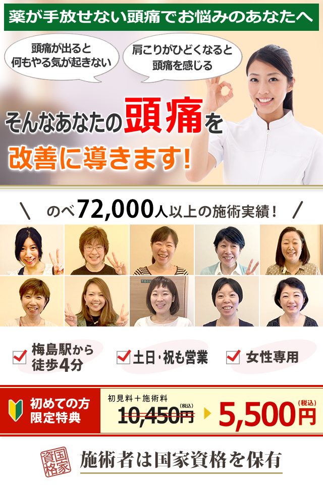 これまで経験したことのない頭痛にみまわれ、整体に行ったり脳外に行ったりしましたが、根本的な解決は期待できず、すずらん鍼灸院に来ました。